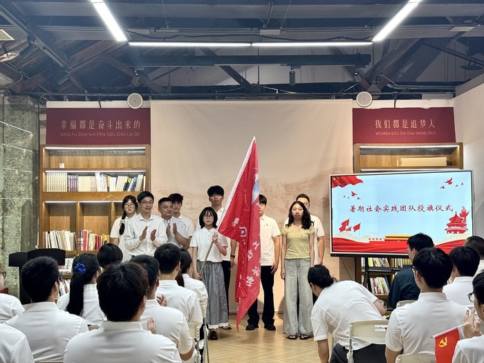 “我志愿加入中国共产党……”在全体党员宣誓后,朱兴丰老师宣读了《毕业生党员倡议书》,鼓励学子们走出校园后要牢记党员身份,坚定信念,永葆本色;志存高远,矢志奋斗,将个人理想融入强国建设、民族复兴的伟大事业中,让青春在为党和人民的不懈奋斗中绽放绚丽之花。随后举行的授旗仪式上,我院两位老师与机械学院新发展党员组成的“龙城智造 时光探迹”暑期社会实践团队从机械工程学院领导手中接过印有“匠心传承”字样的旗帜,他们将带领实践团队围绕“常州工业遗产赋能大学生爱国主义教育”主题开展调研。