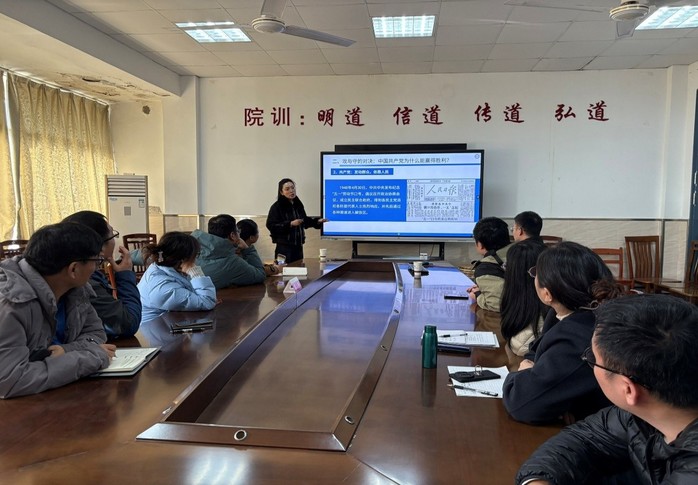为进一步提升中国近现代史纲要课的教学效果,12月9日上午,中国近现代史纲要教研室举行集体备课会,邀请来学院作经验分享的全国高校思想政治理论课教学展示特等奖获得者,江苏师范大学马克思主义学院李丹博士进行现场展示,中国近现代史纲要教研室部分教师参加。